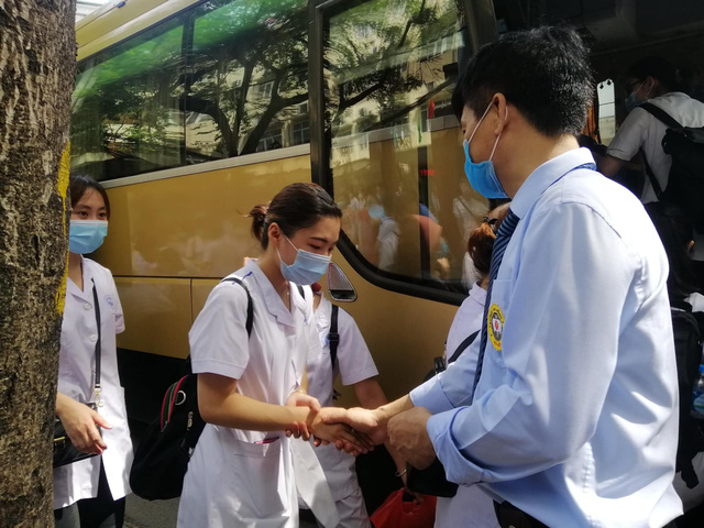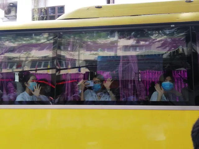 "Đoàn quân" gồm 191 sinh viên và 28 giảng viên lên xe di chuyển tới UBND tỉnh Bắc Giang nhận nhiệm vụ theo chỉ đạo của Sở Y tế Bắc Giang.