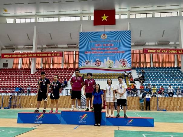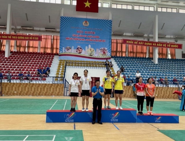 Đồng chí Đặng Thị Phương Hoa - Phó chủ tịch Thường trực Liên đoàn Lao động thành phố trao giải Nhất, Nhì, Ba nội dung càu lông đôi nam – nữ